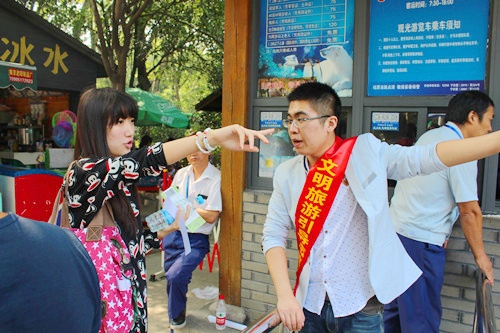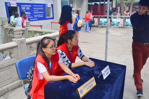 他们身穿红色马甲活跃在中山陵的各个景区,为游客们解答各类问题,维持乘车点的安全和秩序,引导和劝阻景区内的不文明行为。首次参加志愿者活动的同学们做足了功课,不仅提前到一些重要景点踩点,还向景区工作人员请教景点的换乘线路以及最佳的游览线路等。面对不同的游客群体,志愿者们都很热情,一名在博爱广场上服务的志愿者说:“一名韩国游客不知道去明孝陵怎么走,我就带他去坐车,一路把他送到景区门口。”他的举动受到了众多游客的交口称赞。