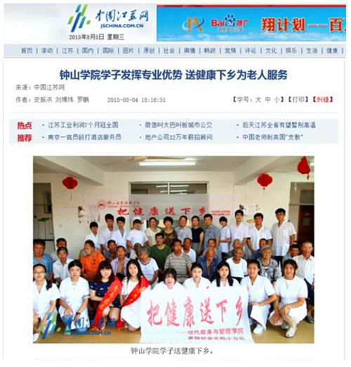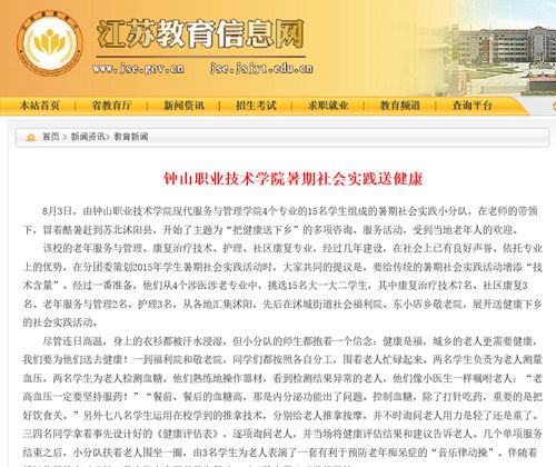 8月4日,中国江苏网、江苏教育信息网以《钟山职业技术学院学子发挥专业优势送健康下乡为老人服务》为题,对我院进行报道,全文如下: