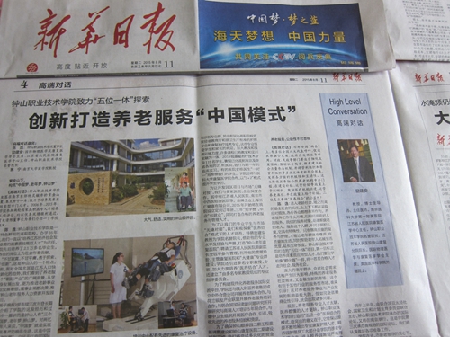 《扬子晚报》曾连续三次刊登长篇报道,介绍了学院的这段经历和过程。其中一篇讲的是钟山人有“三个梦”:中国梦、老年梦、钟山梦。对两亿中国老年人来说,“中国梦”就是实现幸福且具尊严的晚年生活,这是中国老人的“老年梦”。立足于打造同国际接轨的国际交流平台,培养高素质养老服务人才,建设最好的老年颐养社区和最好的老年康复医院,开展养老服务重大课题的研究,帮助老人们实现“老年梦”,这是我们学院投身养老事业的“钟山梦”。投资数十亿元的“五位一体”开发园区项目,承载着“三个梦”的使命,也承载着钟山人在养老服务事业和产业发展中的雄心。