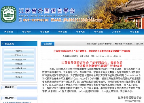 为了贯彻落实《国家中长期教育改革和发展规划纲要(2010-2020)》和《教育信息化十年发展规划(2011-2020年)》的精神,提高江苏省高等院校英语教师应用现代信息技术辅助教学及科研的水平,深化高等院校外语教学改革,推动外语教学的内涵发展和质量提升,江苏省外国语言学会面向学会会员和省内有关高等院校征集一批“基于网络化、智能化的外语教学创新研究课题”。经过学术委员会专家的严格评审,评出10个重点资助项目,20个一般资助项目和11个一般立项项目,报请省社科联从2015年度应用研究精品工程外语类课题中予以立项。基础教育学院张军副教授主持申报的课题“智能化的职业英语一体化网络教学平台研究”获批为一般资助项目。蓝鸽集团江苏分公司(南京鼎傲科技有限公司)将为评审立项项目提供无偿的技术支持服务。(文:樟树)
