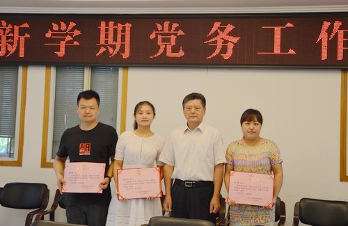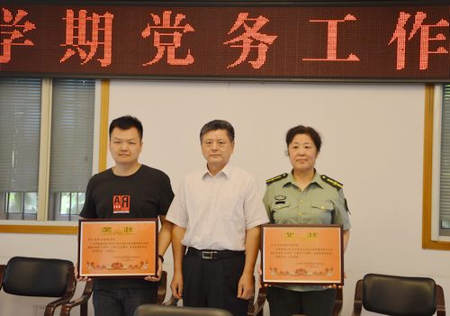 党委组织部部长于馨颖首先宣读学院开展的“纪念中国人民抗日战争暨世界反法西斯战争胜利70周年”主题征文比赛获奖名单。党委书记杨四海分别为优秀组织奖单位、个人一等奖获得者颁发奖状和荣誉证书。于馨颖从六个方面对我院上半年的党建工作作了简要回顾,并对新学期的党务工作作了详细说明。一是关于党校培训工作,各二级学院分党校9月份要对新生开展入党启蒙教育、理想信念教育,党委党校拟于12月上旬举办第24期入党积极分子培训班;二是党员发展工作,要严格执行《江苏省大学生党员发展工作“三投票三公示一答辩”实施办法》及学院的有关文件要求,并通报了本学期各基层党组织发展党员计划;三是加强对预备党员的教育培训,特别是要引导预备党员积极参与志愿服务活动,充分发挥模范带头作用;四是本学期将举办党务工作者培训班,开展党建与思政研究课题的申报并立项;五是关于加强党员的教育和管理,每月的基层党组织生活要正常进行,12月份开展最佳党日活动的评比;五是继续充分发挥党建与思政研究会的作用,上学年全院已有13项课题顺利结题,本学期学院将召开2015年党建与思政研究会年会暨优秀论文表彰会;六是根据省委教育工委的文件要求,结合学院制定的“三严三实”专题教育活动实施方案,各党(总)支部要按计划认真开展“三严三实”专题教育,着重强化整改落实工作。