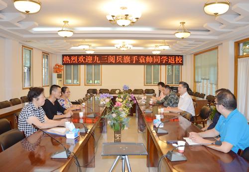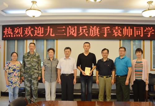 9月3日,我院土木与环境工程学院的袁帅同学(来自于38军113师)参加了“九三”阅兵式(东北抗联英模部队方队)并选为旗手。近期,袁帅同学退伍返校。9月16日,学院为其举行了欢迎会。党委书记杨四海,副院长陈俊,学工处处长、武装部部长宋庆彬,宣传部部长于馨颖,人武部副部长赵成科,土木与环境工程学院党总支书记、学工副院长戴棣华,辅导员屠远出席欢迎会。