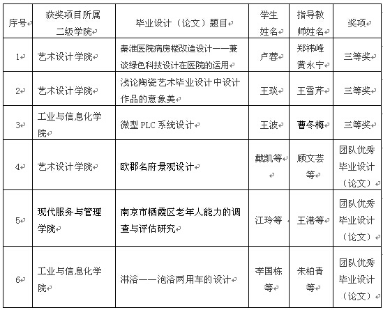 日前,《省教育厅关于公布2014年江苏省普通高等学校本专科毕业设计(论文)评优与抽检结果的通知》(苏教高〔2015〕9号)发布,我校共获得省级优秀毕业设计(论文)6项,其中三等奖3项,团队优秀毕业设计(论文)3项。