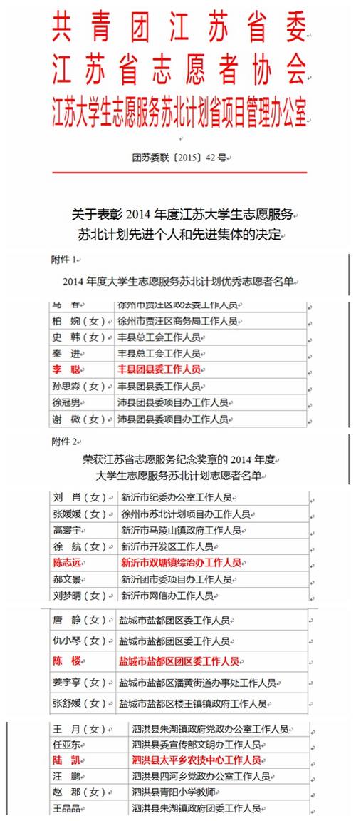 根据共青团江苏省委、江苏省志愿者协会、江苏大学生志愿服务苏北计划省项目管理办公室联合下发了团苏委联[2015]42号《关于表彰2014年度江苏大学生志愿服务苏北计划先进个人和先进集体的决定》公布,我院工业与信息化学院志愿者李聪荣获2014年度苏北计划优秀志愿者称号,现代服务与管理学院陈志远、土木与环境工程学院陈楼、陆凯(续签)三名志愿者荣获2014年度江苏省志愿服务纪念奖章。