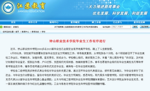 近日,江苏省教育厅网站以《钟山职业技术学院毕业生工作有序进行》为题,对我院进行报道,全文如下: