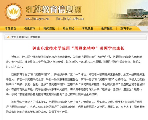 6月30日,江苏教育信息网以《钟山职业技术学院用“周恩来精神”引领学生成长》为题,对我院进行报道,全文如下: