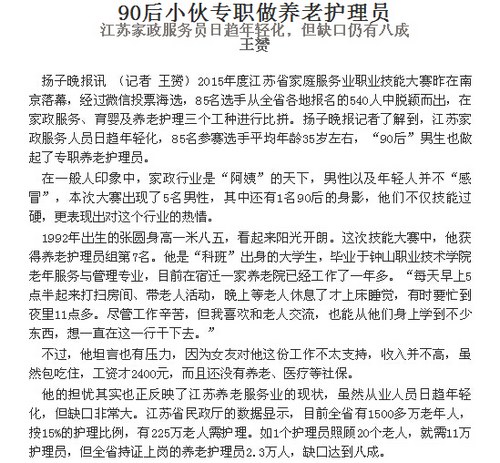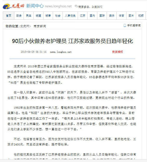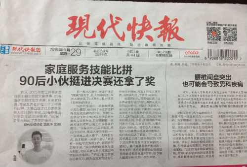 6月29日,现代快报、扬子晚报、龙虎网等多家媒体,报道了我院2014届老年服务与管理专业毕业生张圆参加2015年度江苏省家庭服务业职业技能大赛获奖的事迹。