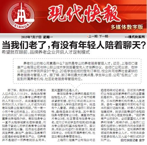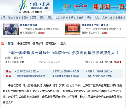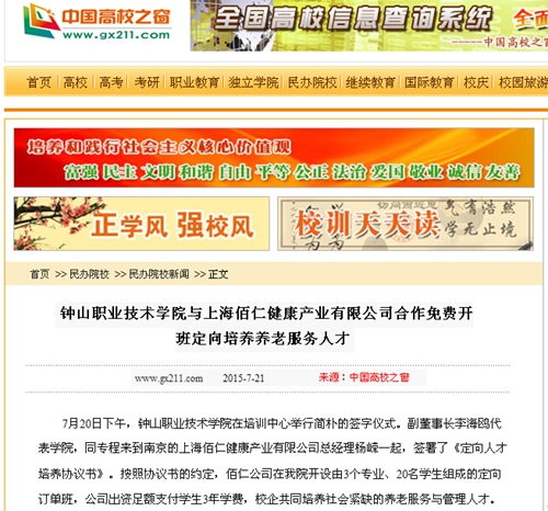7月20日下午,学院在培训中心举行简朴的签字仪式。副董事长李海鸥代表学院,同专程来到南京的上海佰仁健康产业有限公司总经理杨嵘一起,签署了《定向人才培养协议书》。按照协议书的约定,佰仁公司在我院开设由3个专业、20名学生组成的定向订单班,公司出资足额支付学生3年学费,校企共同培养社会紧缺的养老服务与管理人才。