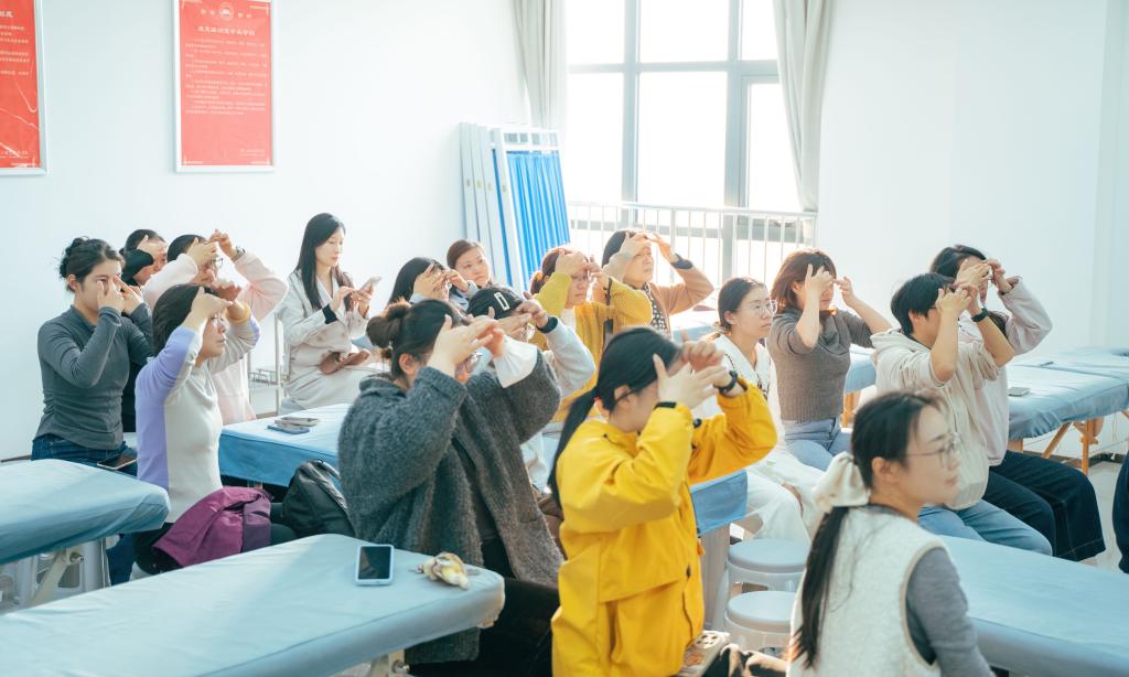 现场体验与互动跟学环节氛围热烈,女教师们在专业指导下亲身体验艾灸、刮痧等养生方式,同步学习简单实用的自我保健技巧。