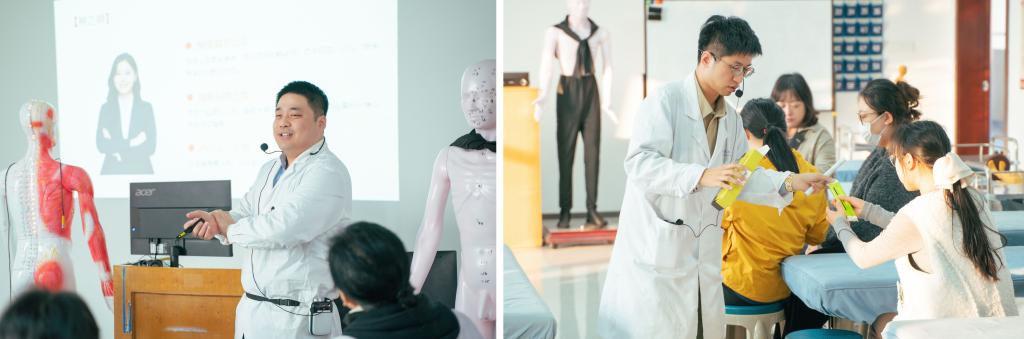 健康管理与康复学院张一鸣老师以“秋收・养阴・润美人”为题,用通俗语言结合典型案例,从衣、食、住、行多方面普及中医养生知识,讲解秋冬女性养生原则、饮食调理、起居要点及常见健康问题预防,同时提醒并纠正影响健康的不良生活习惯,让老师们深切感受中医的博大精深与独特价值。苏杨老师围绕“面部刮痧与美容”展开分享,介绍常见职业病调理方法、艾灸原理功效、刮痧基础知识,演示针对疲劳、感冒、肩颈酸痛的刮痧手法与部位,以及颈椎病、肩周炎、腰背不适等职业病的艾灸穴位与操作流程。