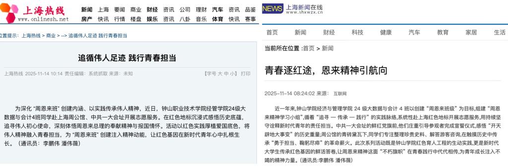 为深入践行《教育强国建设规划纲要(2024—2035 年)》中 “充分发挥红色资源育人功能”的要求,推进“周恩来班级”创建走深走实,近日,经济与管理学院2024级大数据与会计专业4班学子走进上海周公馆与中共一大会址,以主题志愿服务为载体,将周恩来精神传承与红色文化传播融为一体,在知行合一中书写新时代青年的责任担当,相关事迹获上海热线、上海新闻在线等媒体专题报道,为高校红色育人实践树立了鲜活典范。