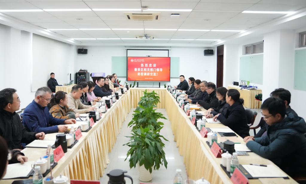 蒋伏心校长对秦淮区政企领导的莅临表示热烈欢迎。他简要介绍了学校的办学特色与发展成就,并强调学校始终坚持以服务区域经济发展为宗旨,致力于高校、政府、企业三方合作交流,期待通过与秦淮区及龙头企业的深度合作,共同探索高素质技术技能人才培养的新模式,为学生成长成才搭建更广阔的平台。