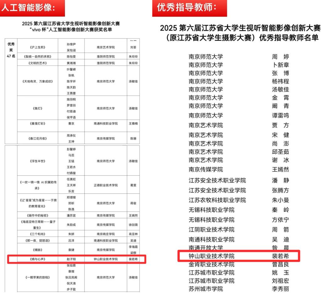 近日,2025“智镜共生•青年实验场”第六届江苏省大学生视听智能影像创新大赛评选结果公布。本届大赛由江苏省摄影家协会、江苏省高等教育学会摄影专业研究委员会等单位联合举办,共吸引全省七十余所高校的2900余组作品参赛,经评审,298件作品获奖。