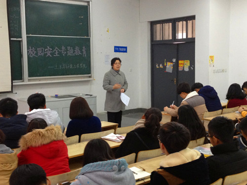 分院党总支书记、副院长戴棣华首先宣读了《院土学字[2015]39号关于评选学生安全先进个人和安全工作标兵的通知》,文件旨在表彰在校园安全工作中发挥突出作用并做出贡献的同学,尤其是在平时的学习与日常生活中遇到特殊情况、突发事件能依法、依章办事,理性处理,使矛盾化解以及发现事故隐患能及时、妥善处理并上报,使问题消灭在萌芽状态的同学。会上,重点表扬了2014级建筑工程技术一班的戴伟、2013级工程造价3班的董洪浩两位同学,他们在面对突发事件的时候不冲动,不感情用事,以包容谦让的态度冷静处理,避免了事态的恶化的做法值得大家学习。她还就遇到突发事件如何处理、处理的原则、方法、程序做了讲解。针对学校最近发生的一系列案(事)件,要求每一名学生干部,一是要做好安全工作的宣传者,使同学们的安全意识内化于心,外化于行;二是以身作则,做好安全工作的执行者,以自己的实际行动带动他人;三是务实工作,做好安全工作的管理者,在辅导员和学生之间起到桥梁和纽带的作用。