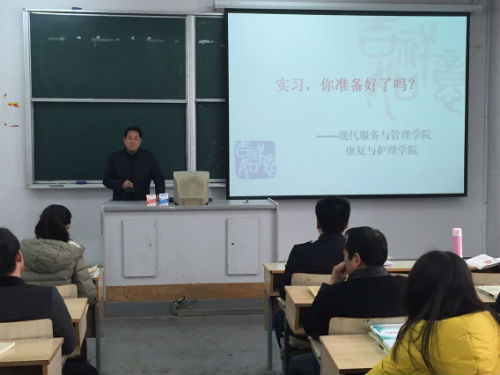 分院副院长孙国庆首先阐释了康复的重要性,鼓励学生要做“执着、质朴、自立、自信”的钟山人。他提出了医学的基本原理:即人学—仁学,并从生理和心理两大方面对其进行了阐述。他强调实习前要调试好自身的心理状态,提高自我素质涵养,稳抓“三基”(基本知识,基本技能,基本理论)。实习过程中注重品行的重要性,注意实习的方式、方法。他希望同学们在临床工作中能够做到“五勤”:“口勤”、“手勤”、“脑勤”、“腿勤”、“眼勤”。他要求同学们“勿悲勿傲”,克服骄气、傲气、严于律己,全身心投入到实习中去,并预祝各位同学实习取得圆满成功。(文:赵云林、温婉娟 摄影:赵云林)